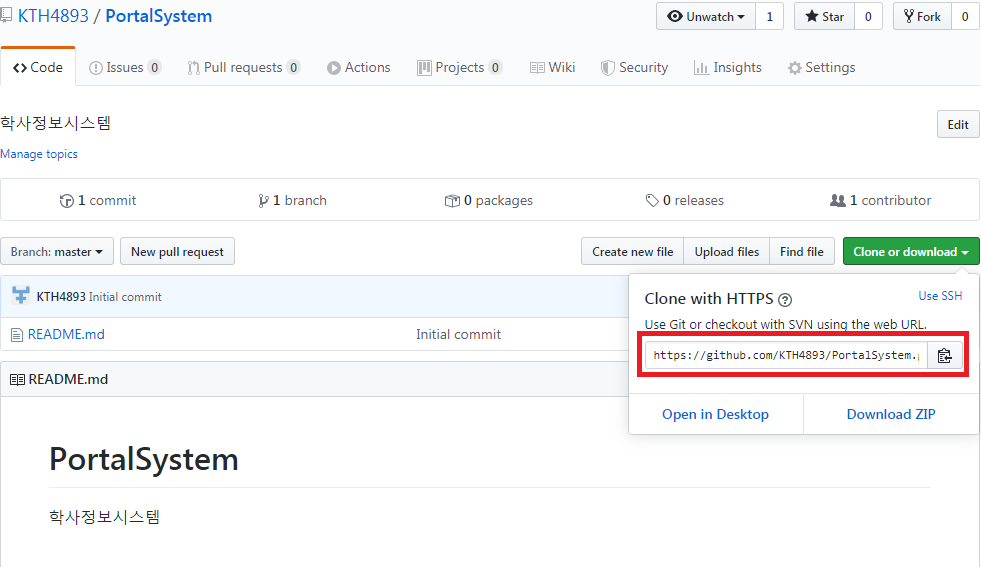 Clone or download를 클릭하면 Git repository의 주소를 복사할 수 있다.