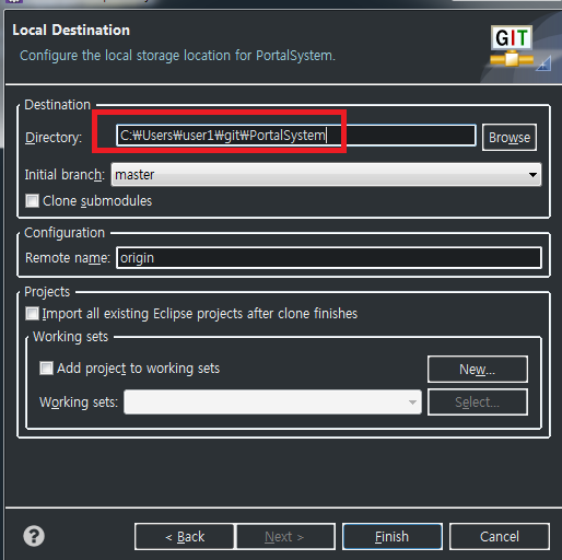 Directory에 소스파일들이 저장될 경로를 지정해주고 Finish해주면 연동이 완료된다.
