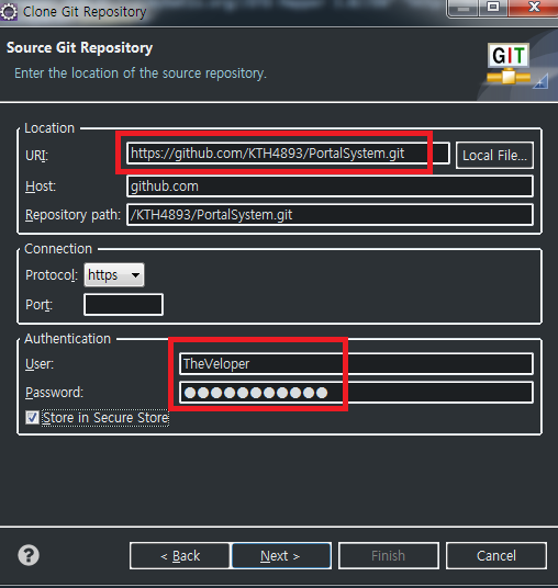 Authentication에는 Github에 접속하는 계정이름과 비밀번호를 적어준다.