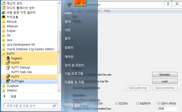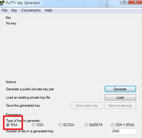 Putty gen 열기 -> Type of key to generate (RSA선택)