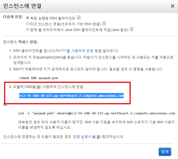 Public DNS를 복사해서 붙여 넣어줍니다.