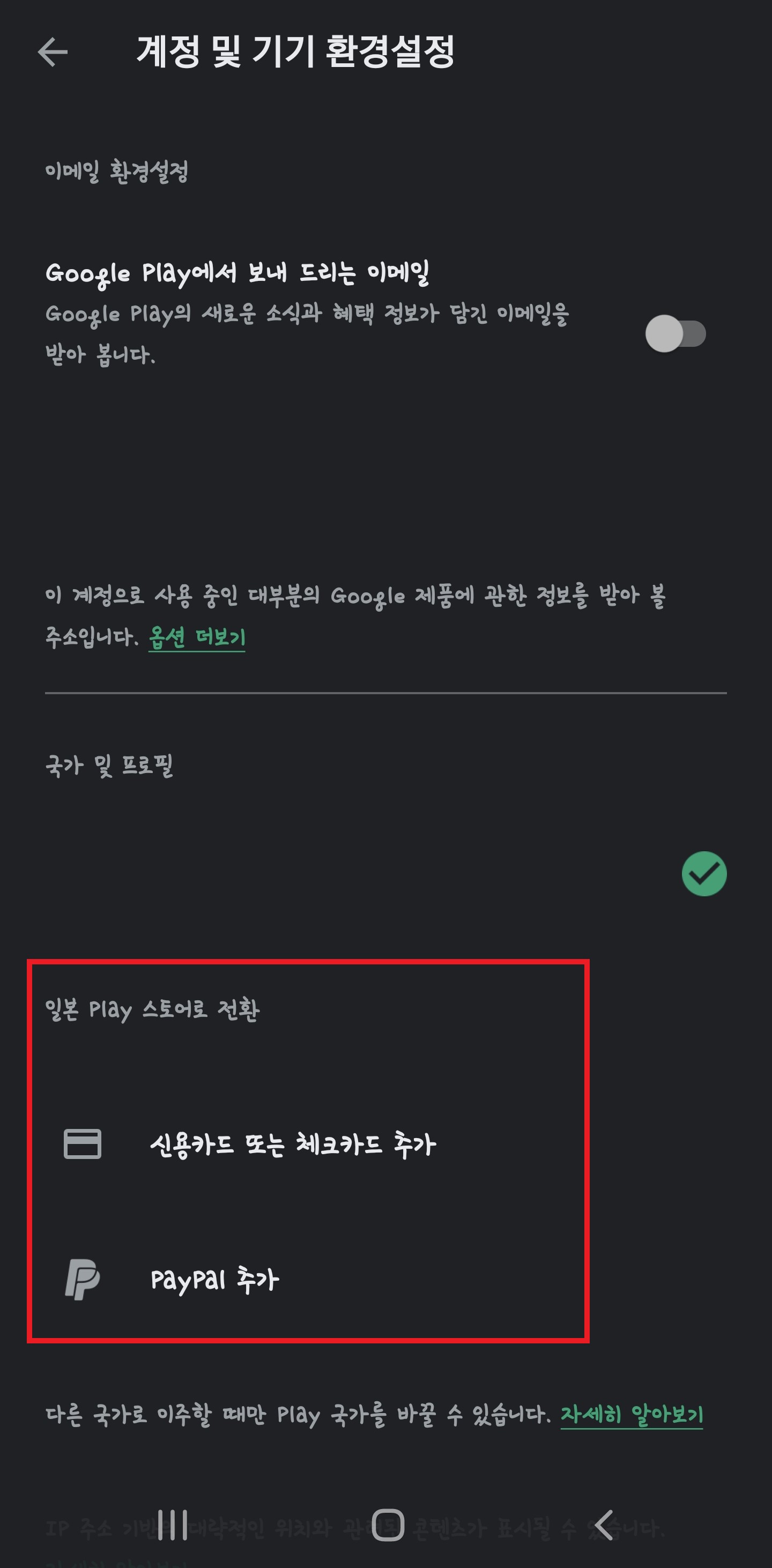 해외서버로 우회했어도 구글계정을 해외로 설정해주지 않으면 위와같이 글로벌 버젼을 받을 수 없는데요