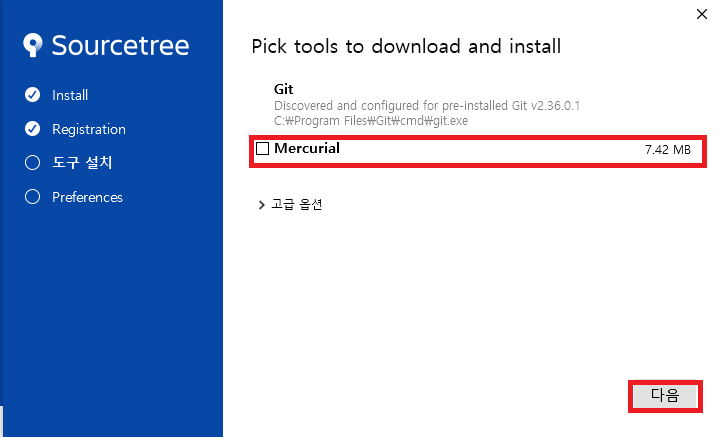 Mercurial 은 우리는 상관없으니 체크 해제하고 다음을 눌러주자
