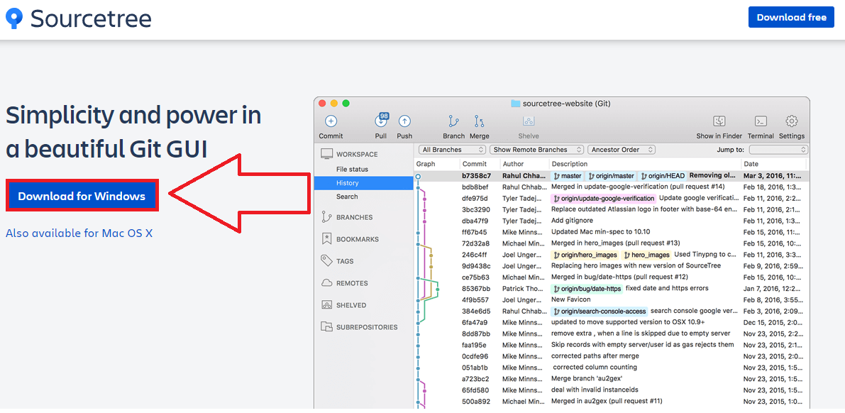 A Git GUI that offers a visual representation of your repositories. Sourcetree is a free Git client for Windows and Mac.
