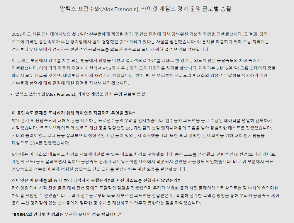 라이엇 글로벌 총리가 입장문을 올림과 동시에