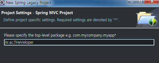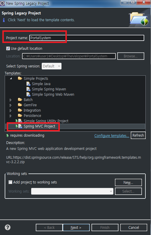 이렇게 프로젝트 이름과 Spring MVC Project를 체크해주시고 Next